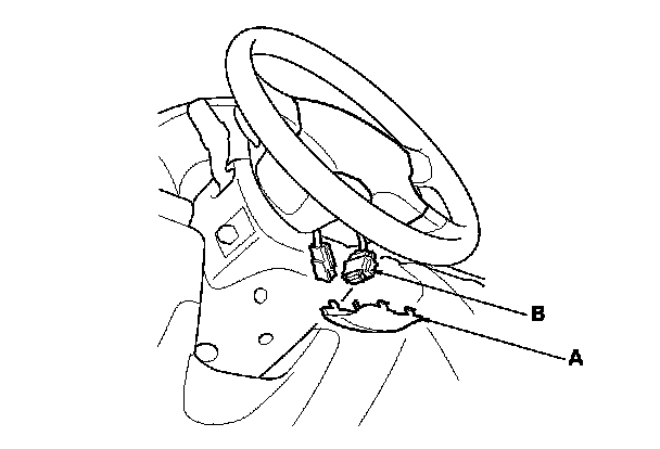 3. Remove the access panel (A) from the steering wheel, then disconnect the driver's airbag 4P connector (B) from the cable reel.