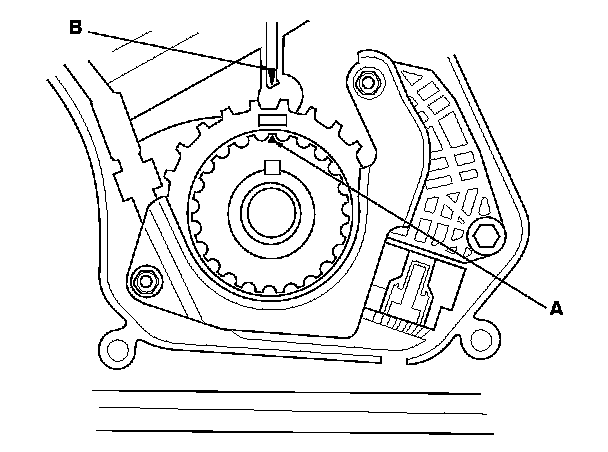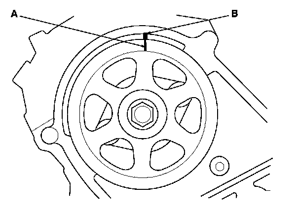 3. Set the timing belt drive pulley to top dead center (TDC) by aligning the TDC mark (A) on the tooth of the timing belt drive pulley with the pointer (B) on the oil pump.