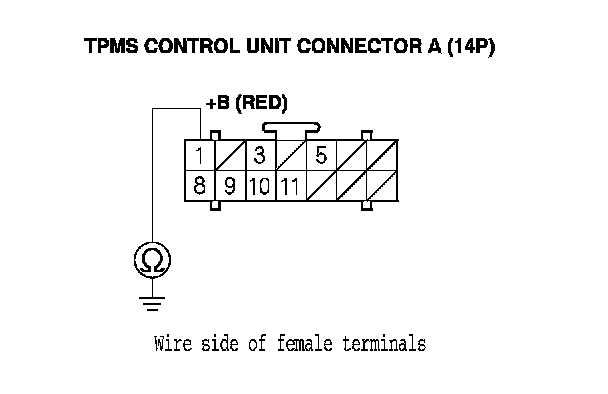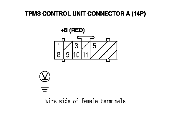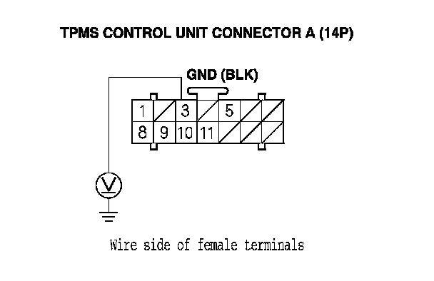 13. Measure the voltage between body ground and TPMS control unit connector A (14P) terminal No. 1.