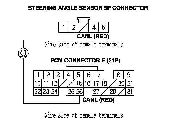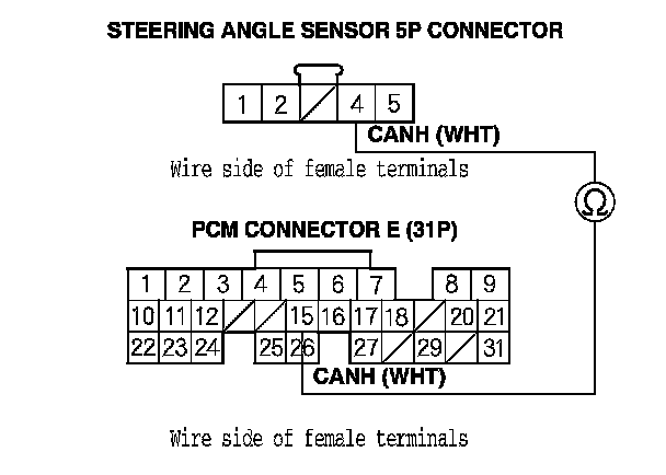 19. Check for continuity between PCM connector terminal E26 and steering angle sensor 5P connector terminal No. 2.