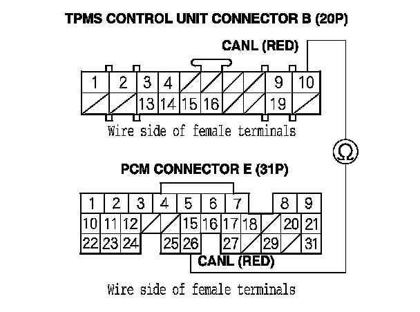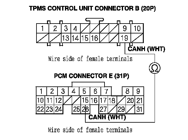 11. Check for continuity between PCM connector terminal E15 and TPMS control unit connector B (20P) terminal No. 19.
