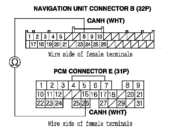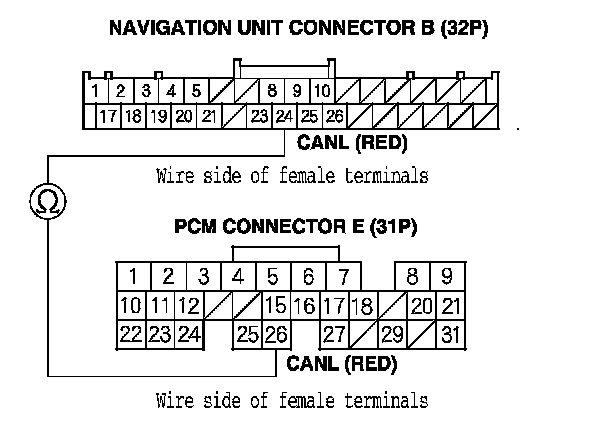 12. Check for continuity between PCM connector terminal E15 and navigation unit connector B (32P) terminal No. 8.