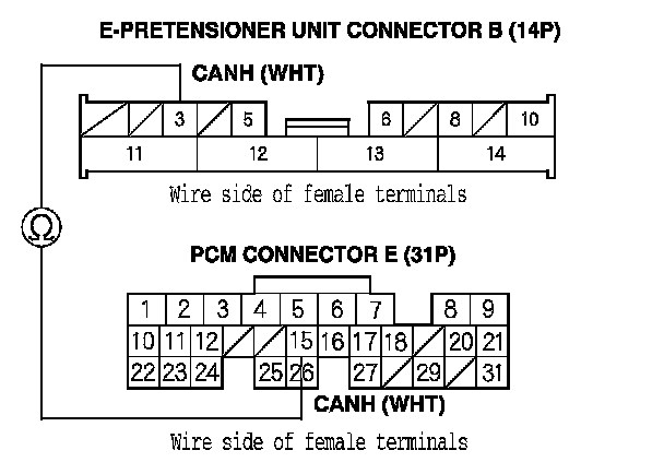 23. Check for continuity between PCM connector terminal E26 and e-pretensioner unit connector B (14P) terminal No. 5.