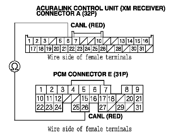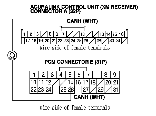 24. Check for continuity between PCM connector terminal E26 and AcuraLink control unit (XM receiver) connector A (32P) terminal No. 6.