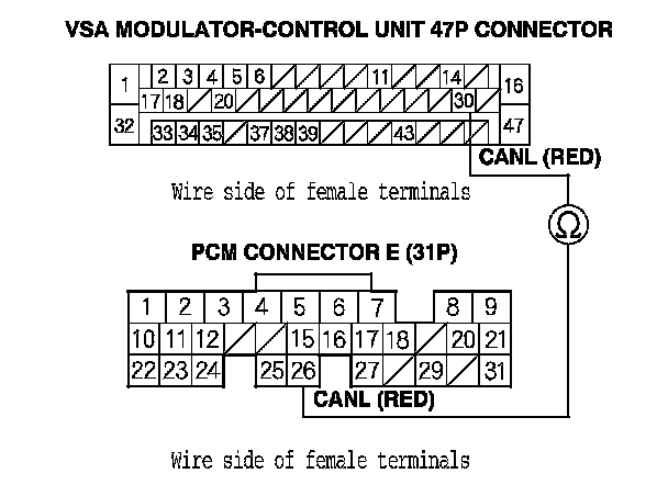 17. Check for continuity between PCM connector terminal E26 and VSA modulator-control unit 47P connector terminal No. 30.