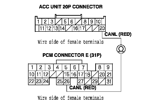 13. Check for continuity between PCM connector terminal E15 and ACC unit 20P connector terminal No. 10.
