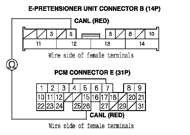 14. Check for continuity between PCM connector terminal E15 and e-pretensioner unit connector B (14P) terminal No. 3.