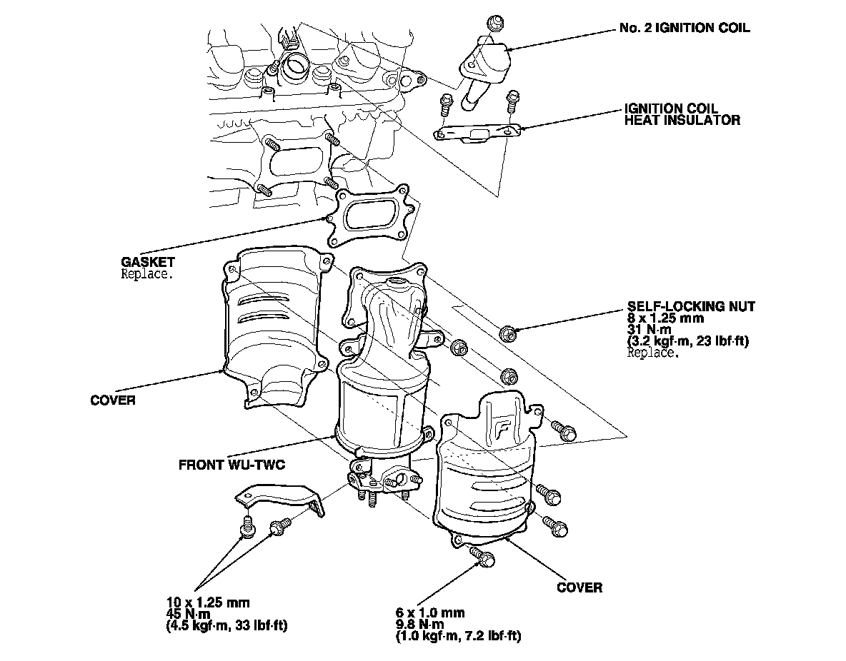 4. Remove the front A/F sensor (Sensor 1) A/F Sensor Replacement and the front secondary HO2S (Sensor 2). Secondary HO2S Replacement