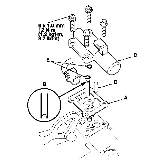 15. Disconnect one of the jumper wires, and check valve movement at the fluid passage in valve body mounting surface. If the valve binds or moves sluggishly, or if the solenoid valve does not operate, replace A/T clutch pressure control solenoid valve C.