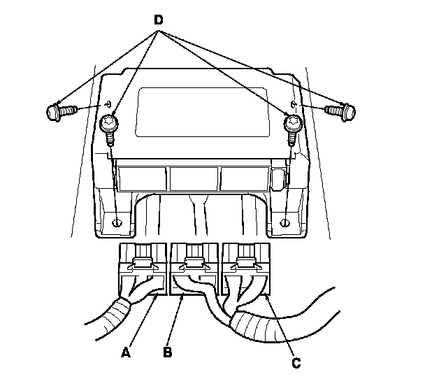 5. Disconnect SRS unit connector A (28P), SRS unit connector B (28P), SRS unit connector C (28P), and remove the TORX bolts (D), then pull out the SRS unit.