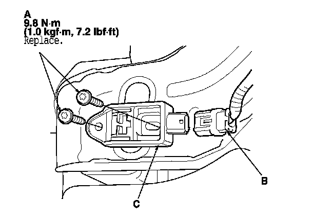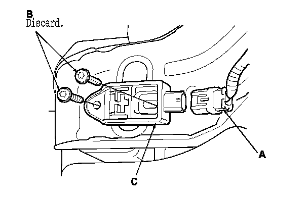 1. Install the front impact sensor with new TORX bolts (A), then connect the engine compartment wire harness 2P connector (B) to the front impact sensor (C).