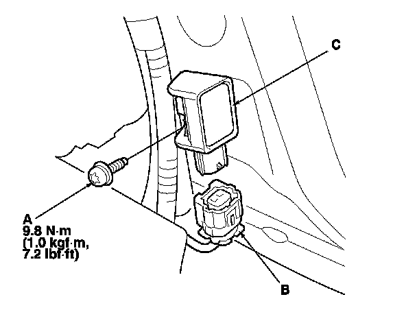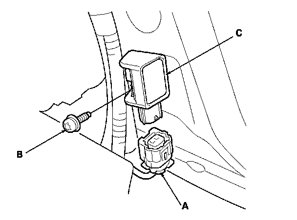 1. Install the side impact sensor (first) with a new TORX bolt (A), then connect the left or right side wire harness 2P connector (B) to the side impact sensor (first) (C).