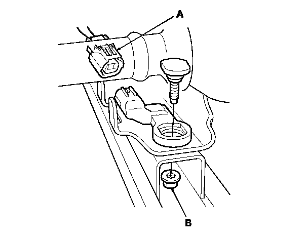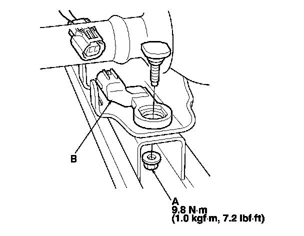 1. Install the new driver's seat position sensor with a mounting nut (A), then connect the left side wire harness 2P connector to the driver's seat position sensor (B). Reinstall the seat cover.