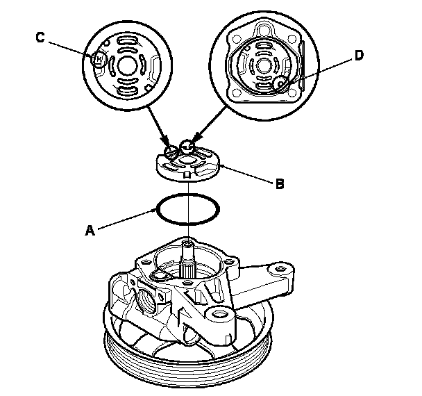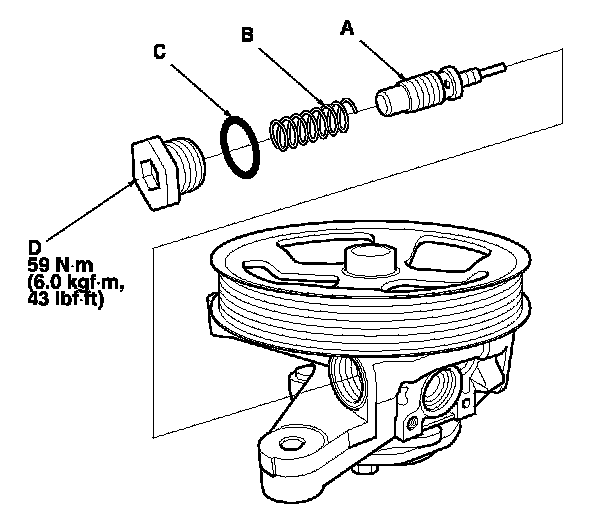 25. Coat the new 19.8 mm O-ring (C) with power steering fluid, and install it on the flow control valve cap (D), then install the cap on the pump housing, and tighten it to the specified torque.