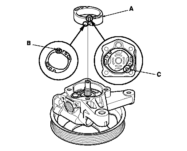 18. Set the pump cam ring (A) with its "MS" mark (B) facing down, and align the slot (C) in the pump housing.