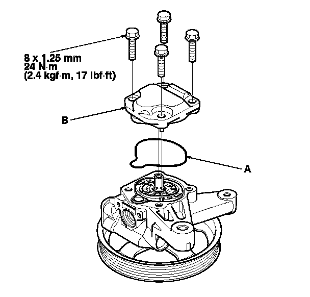 26. Coat the new 15.8 mm O-ring (A) with power steering fluid, and install it on the inlet joint (B). Install the inlet joint on the pump housing.