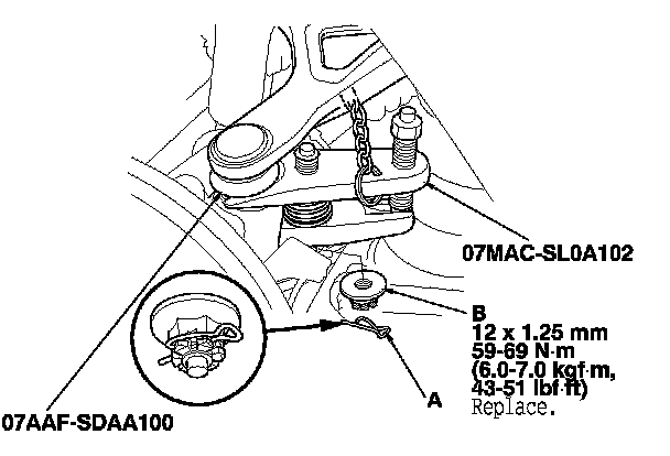 5. Remove the lock pin (A) from the upper arm ball joint, then remove the castle nut (B).