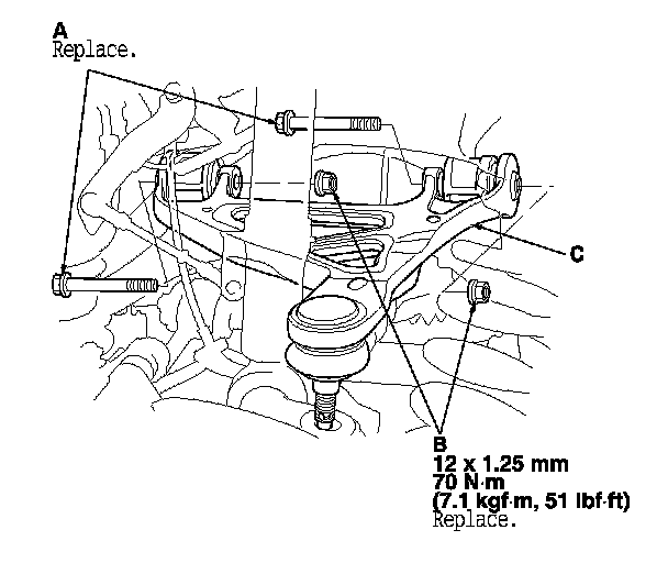 7. Remove the flange bolts (A) and the self-locking nuts (B), then remove the upper arm (C).