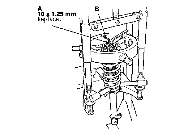 1. Compress the damper spring, then remove the self-locking nut (A) while holding the damper shaft with a hex wrench (B). Do not compress the damper spring more than is necessary to remove the self-locking nut.