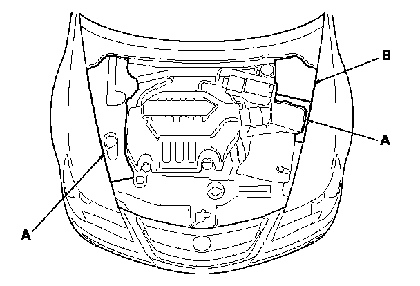 1. Remove the upper fender trims (A) and left upper trim (B).