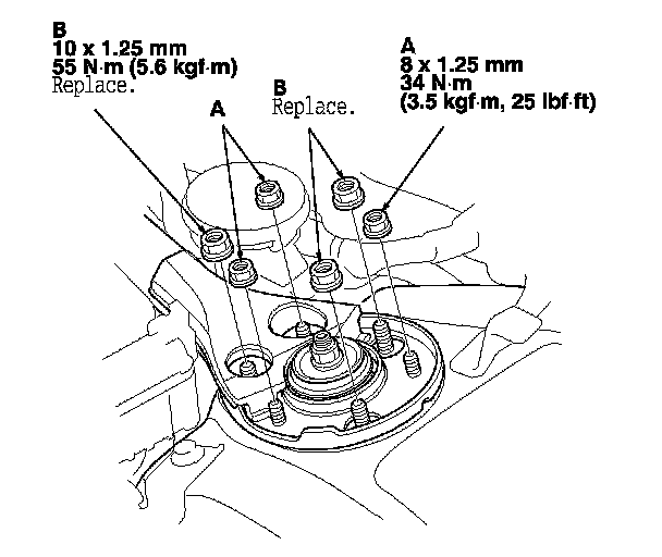 2. Loosely install the 8 mm flange nuts (A) and the 10 mm new flange nuts (B) on the top of the damper.
