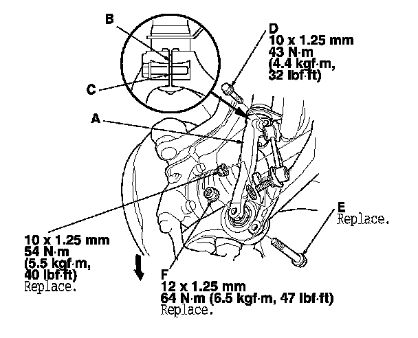 5. Install the new flange bolt (E) to the damper fork and lower arm, then lightly tighten the new damper fork mounting nut (F).