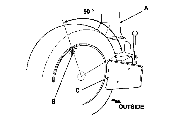 - Position the wheel as shown so the valve stem (B) is 90 degrees from the bead breaker (C) as shown.