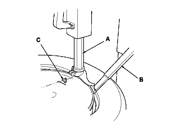 3. Install the tire pressure sensor (A) to the wheel (B), and tighten the valve stem nut (C) finger tight. Make sure the pressure sensor is resting on the wheel.