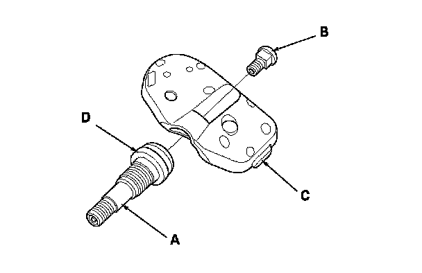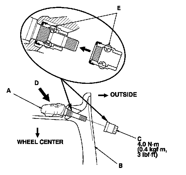 4. Tighten the valve nut to the specified torque while holding the tire pressure sensor toward (D) the wheel. You may hear a snap or pop as you tighten the nut. This is normal.