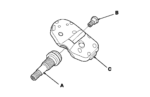 7. Remove and replace the valve stem (A), and the screw (B) from the tire pressure sensor (C).