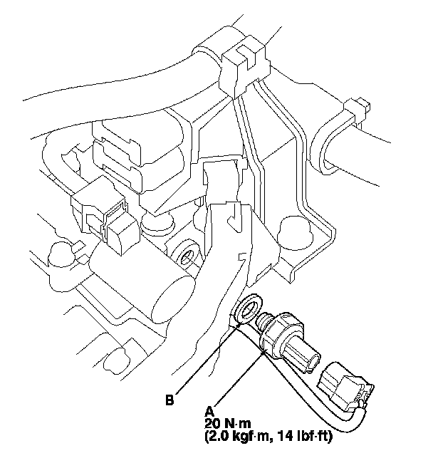 4. Install the new 4th clutch transmission fluid pressure switch and a new sealing washer (B), and tighten the switch.