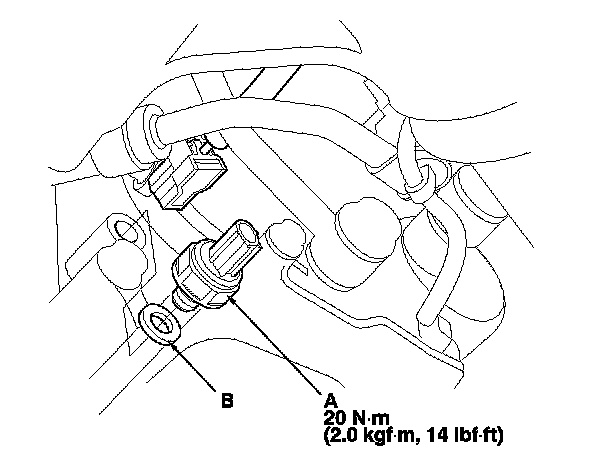 4. Install the new transmission fluid pressure switch B (3rd clutch) and a new sealing washer (B), and tighten the switch.