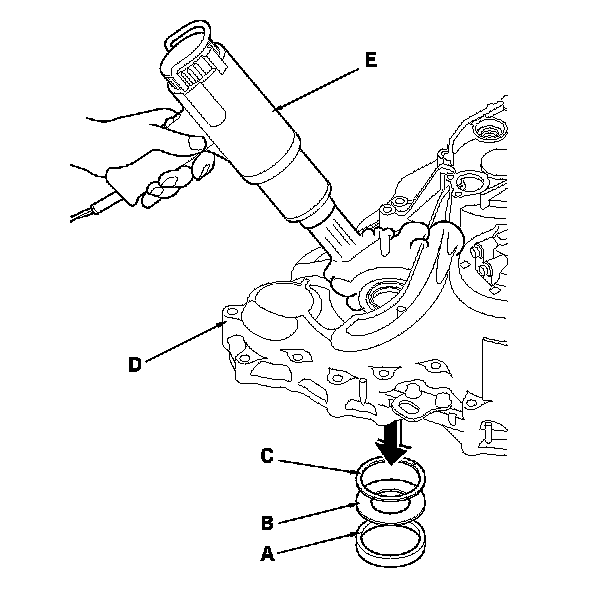 1. Remove the bearing outer race (A), spacer (B), and 85 mm thrust shim (C) from the transmission housing (D) by heating the housing to about 212 °F (100 °C) with a heat gun (E). Do not heat the housing more than 212 °F (100 °C).