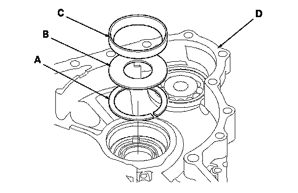 2. Install the 85 mm thrust shim (A), spacer (B), and outer race (C) in the transmission housing (D).