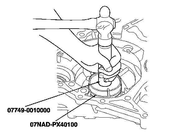 3. Using the driver and the attachment (83 mm), drive the outer race securely in the housing so there is no clearance between the outer race, spacer, shim, and housing.