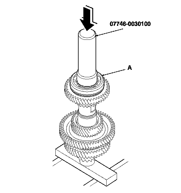 5. Install the ball bearing (A) over the countershaft, then press it into place using the driver (40 mm I.D.) and the press.
