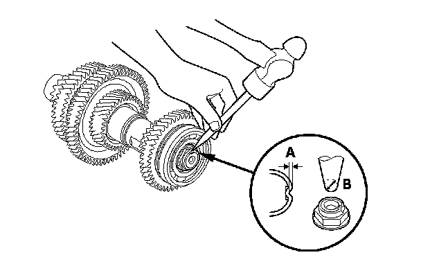 8. Stake the locknut into its shaft in depth (A) of 0.7-1.3 mm (0.03-0.05 in) using a 3.5 mm punch (B).