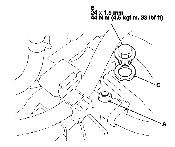 7. Install the ATF filler bolt (B) and a new sealing washer (C).