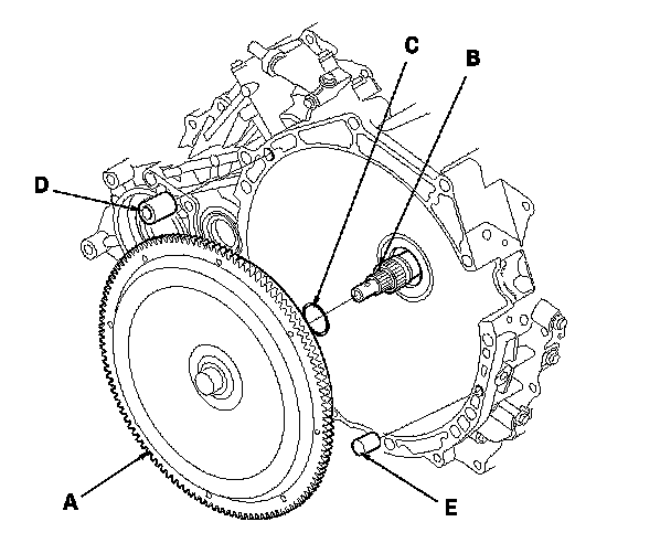 5. Install the 14 mm dowel pin (D) and 10 mm dowel pin (E) in the torque converter housing.