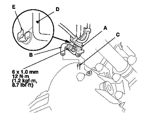 62. Attach the shift cable end to the control lever (C), then insert the control pin (D) into the control lever hole through the shift cable end, and secure the control pin with the spring clip/washer (E).