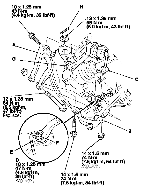 44. Install the tie-rod end ball joints (G) to each knuckle with the nuts and new cotter pins (H).