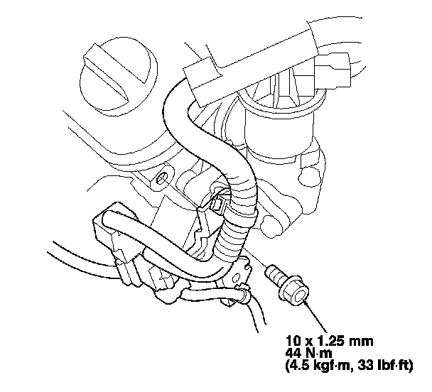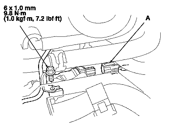 52. Connect the transmission fluid pressure switch A (2nd clutch) connector (A), and secure the vacuum line with the bolt.