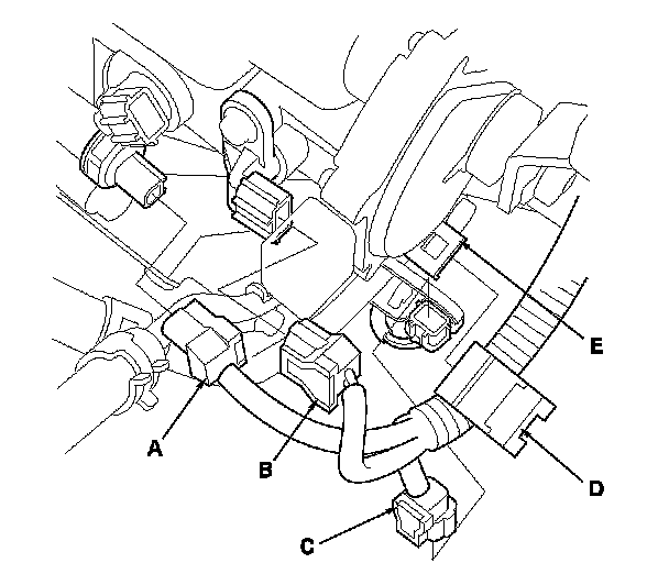 54. Connect the transmission fluid pressure switch B (3rd clutch) connector (A), output shaft (countershaft) speed sensor connector (B), and ATF temperature sensor connector (C), and install the harness clamp (D) on its bracket (E).