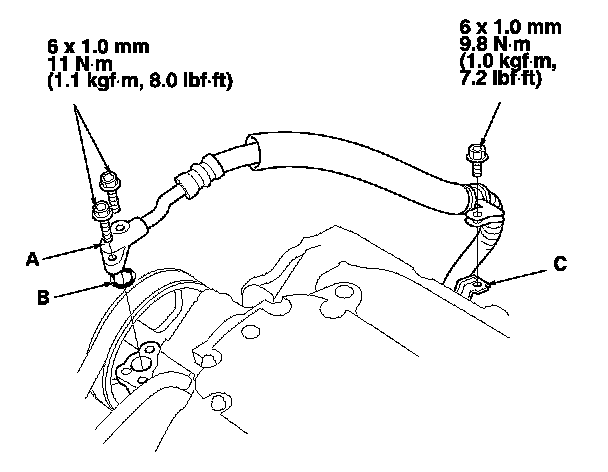 69. Secure the power steering fluid hose clamp with the bolt on its clamp bracket (C).