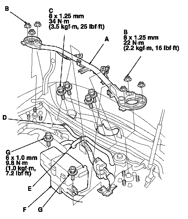 73. Install the under-hood fuse/relay box (F) on its bracket, and secure it with the bolts (G).