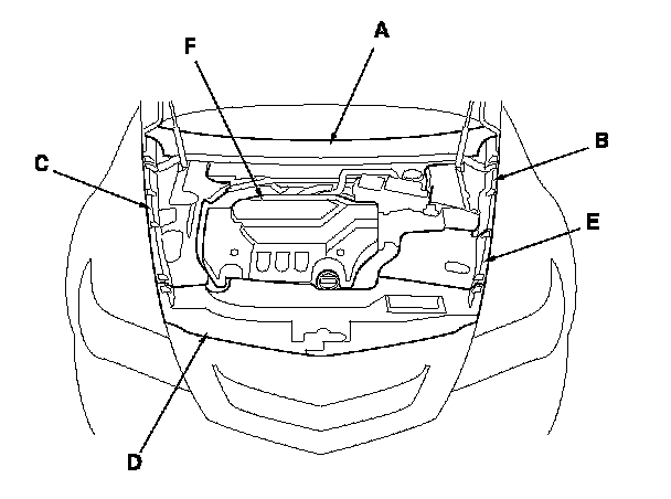 82. Install the covers in the following order; cowl cover upper trim (A), left upper fender trim (B), right upper fender trim (C), upper grille cover (D), battery trim (E), and intake manifold cover (F).