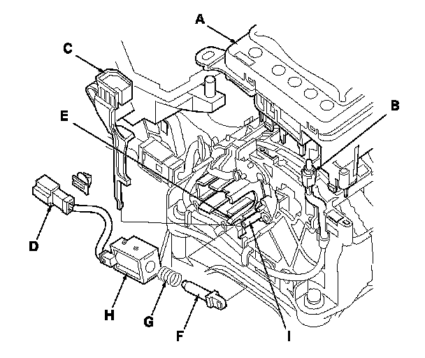 6. Install the shift lock solenoid plunger (F) and plunger spring (G) in the new shift lock solenoid (H).