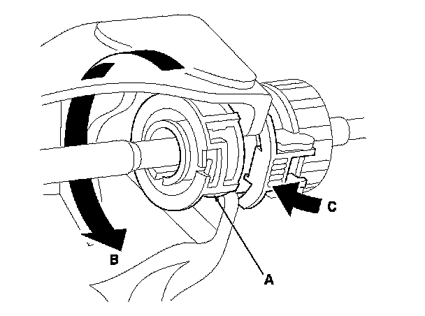 6. Rotate the socket holder retainer (A) counterclockwise (B) until it stops, and push in the retainer (C) to lock it.