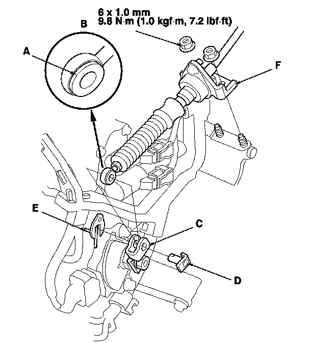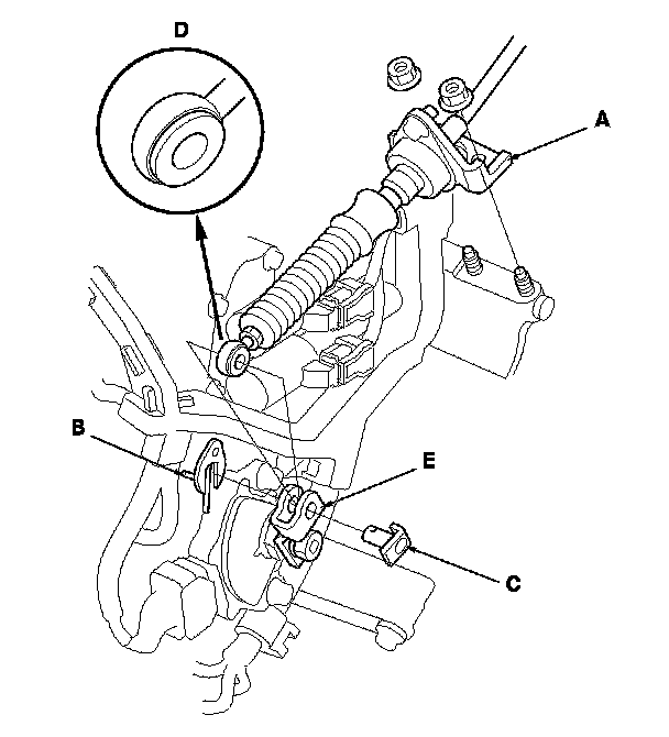 12. Remove the spring clip/washer (B) and control pin (C), then separate the shift cable end (D) from the control lever (E).