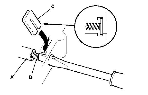 3. Install the valve (A) and valve spring (B) in the valve body. Push the valve spring in with a screwdriver, then install the spring seat (C).